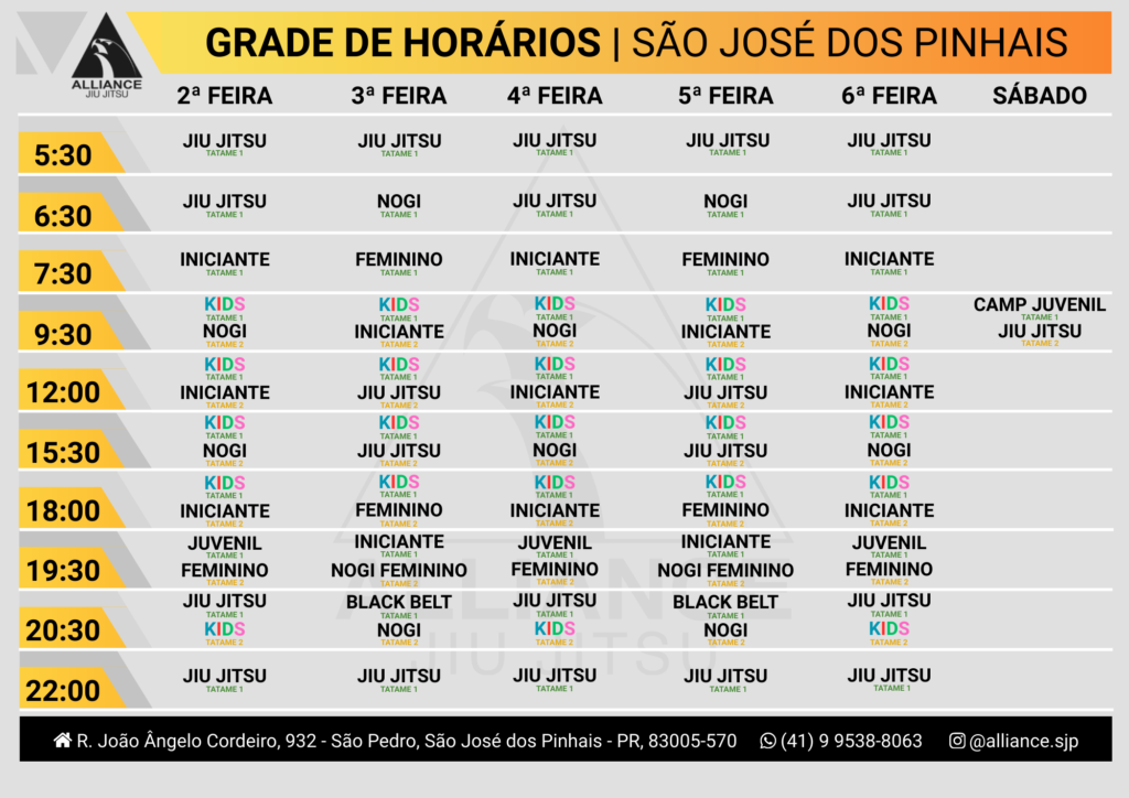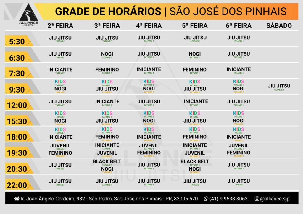 Na Alliance São José dos Pinhais, vivemos o jiu-jitsu com toda nossa paixão. É mais que uma arte marcial; é o que nos motiva diariamente. Cada treino e cada técnica refletem nosso compromisso em transformar vidas, formando pessoas mais fortes e resilientes. Estamos aqui para compartilhar esse amor e dedicação com todos que desejam fazer parte dessa jornada.